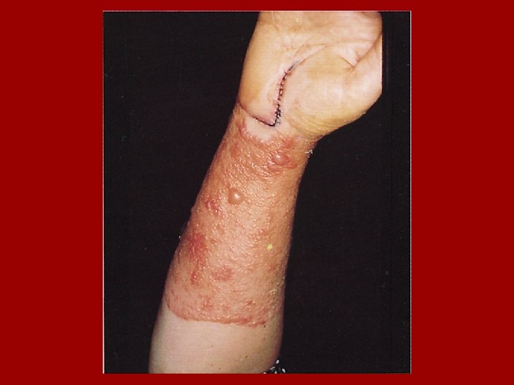 • Paronychia and Onychia – Etiology • Caused by staph, strep and or fungal organisms that accompany contamination of open wounds or hangnails • Damage to cuticle puts finger at risk – Signs and Symptoms • Rapid onset; painful with bright red swelling of proximal and lateral fold of nail • Accumulation of purulent material w/in nail fold – Management • Soak finger or toe in hot solution of Epsom salt 3 times daily • Topical antibiotics, systemic antibiotics if severe • May require pus removal through skin incision