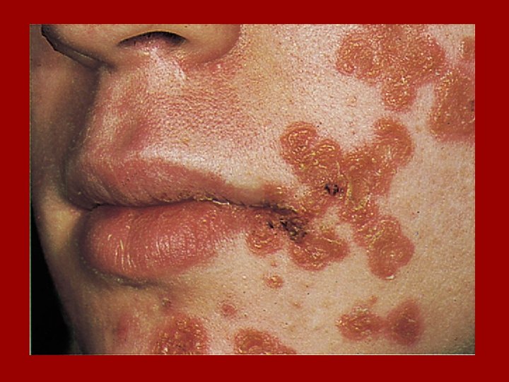• Tinea of the Body (tinea corporis) – Signs and Symptoms • Commonly involve extremities and trunk • Itchy red-brown scaling annular plaque that expands peripherally – Management • Topical antifungal cream