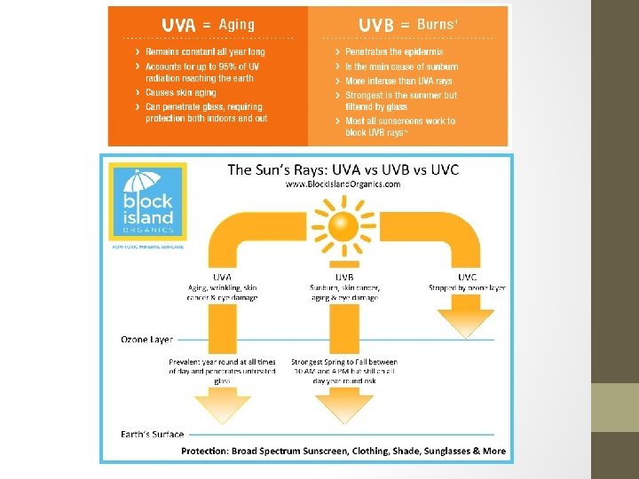 Types of UV Radiation : UV-A UV-B Long waves. Mid waves. 90 % - 95 % Penetrates deeper (Epidermis and dermis. ) DNA and Epidermis. Induces Oxidative stress that stimulates post Non-melanoma skin cancer. -UV inflammation and hyperpigmentation ( Melanin production) Ex. Of damage skin from UV-A : Suntan Synthesis of Vitamin D (But not optimal).