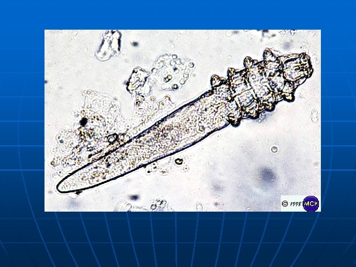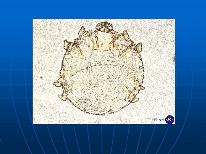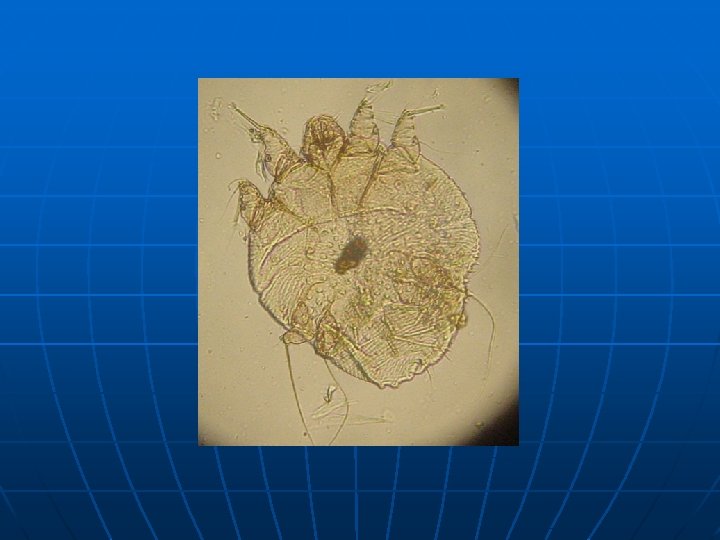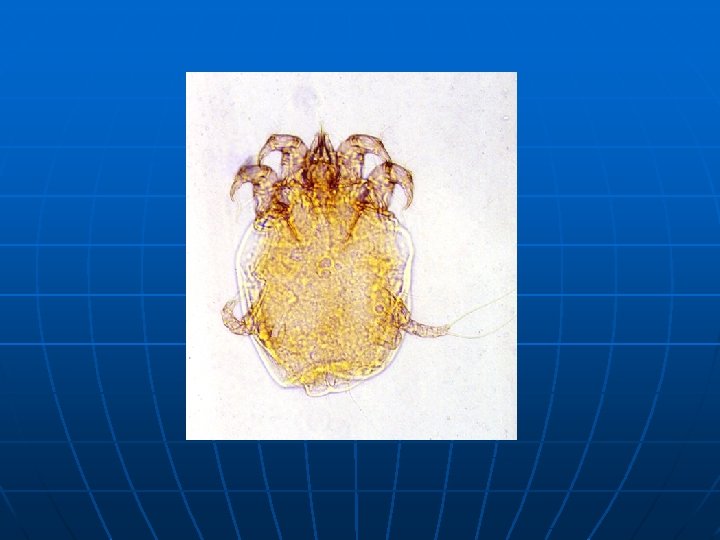 Sarcoptes Scabei n n n n Oval with 8 legs Long unjointed pedicles with suckers on the end. Terminal anus Eggs are oval/brownish Entire life cycle is on host Female mites burrow through epidermis Over 10 -15 day period 40 -50 eggs are deposited in tunnels Larva emerge in 3 -10 days.