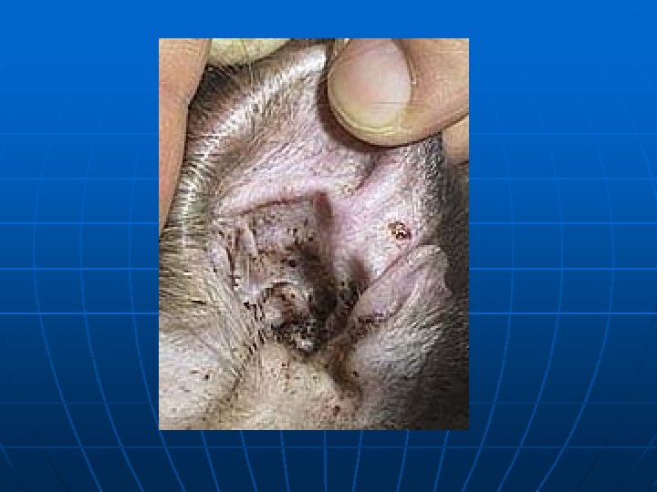 Sarcoptes scabei symptoms n n EXTREME pruritis Erythema, papules, scaling, crusting excoriations. Location: Ears, lateral elbow/hock, ventral abdomen (termed ventral “blowout”). Scratch reflex: When scratch on ear margin, dog scratches.