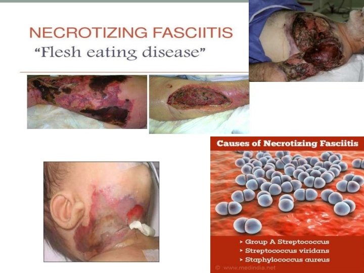 Treatment: • Intravenous antibiotic therapy. • Surgery to remove damaged or dead tissue in order to stop the spread of infection. • Amputations of affected limbs, in some cases.