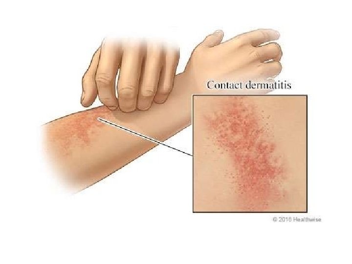 • Contact dermatitis is a red, itchy rash caused by direct contact with a substance or an allergic reaction to it. Ex: cosmetics, fragrances, jewelry and plants • The rash isn't contagious or life-threatening, but it can be very uncomfortable.
