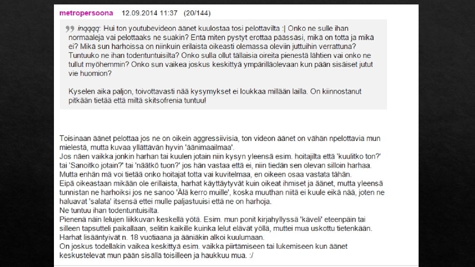 Lähteet § http: //www. terveyskirjasto. fi/terveyskirjasto/tk. koti? p_artikkeli=dlk 00148 § http: //www. skitsofreniainfo. fi/selviytyminen-arjesta/Kirjoittamistyo_auttoi_selviytymaan_skitsofreniasta § http: //www. introspekt. fi/artikkelit/tietoa-skitsofreniasta-totuus-on-harhaa-vain-harha-on-totta/ § http: //www. thl. fi/fi/ § http: //www. youtube. com/watch? v=Q 7 ZSDeec 41 U § http: //www. youtube. com/watch? v=i 4 b-_b. Nsaj. Y
