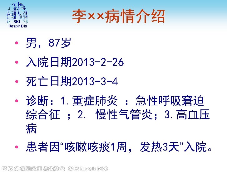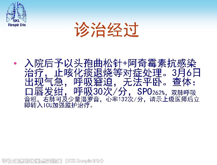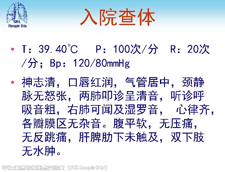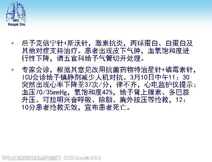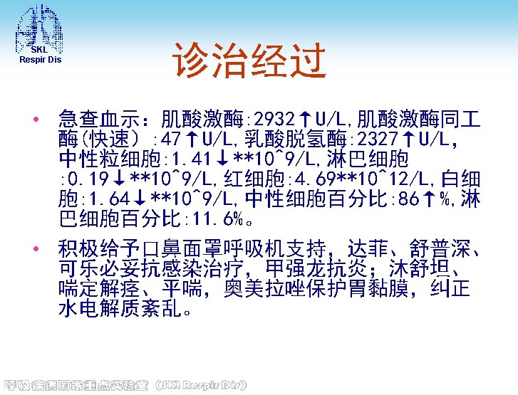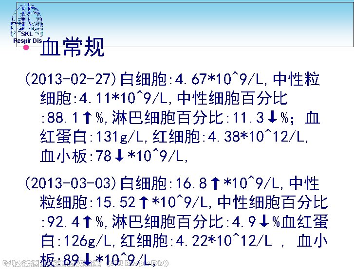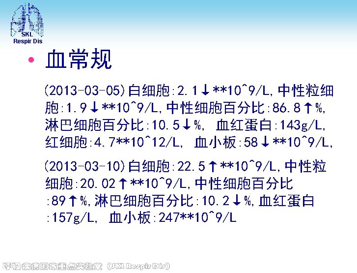 SKL Respir Dis • 电解质 (2013 -02 -27)钾: 3. 7 mmol/L, 钠: 140 mmol/L, 氯: 101 mmol/L, 钙 : 1. 9↓mmol/L, 镁: 0. 96 mmol/L, 磷 : 0. 96 mmol/L • 血糖(2013 -02 -27)8. 6↑mmol/L • 血沉(2013 -03 -03): 8 mm/h。