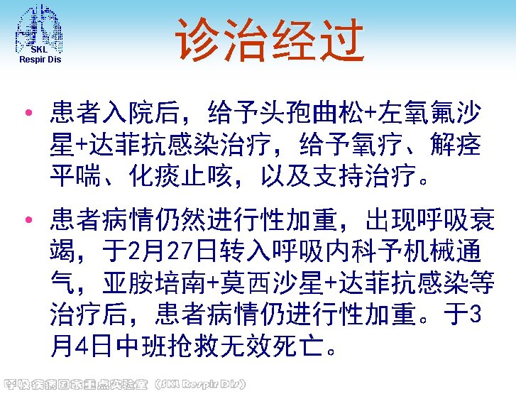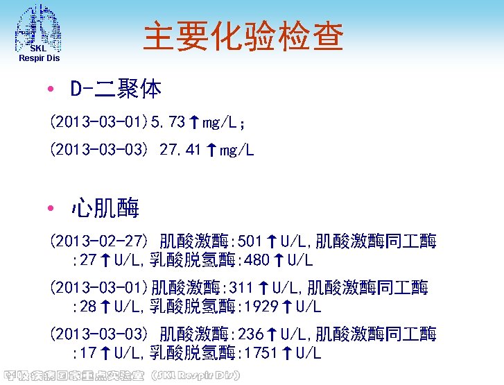 SKL Respir Dis • 肾功能 (2013 -03 -05) 血清尿素: 3. 8 mmol/L, 血清肌酐: 72μmol/L, 血清 尿酸: 169↓μmol/L, (2013 -03 -06) 尿素: 2. 9↓mmol/L, 肌酐: 53↓μmol/L, 尿酸 : 117↓μmol/L (2013 -03 -07) 血清尿素: 4. 6 mmol/L, 血清肌酐: 51μmol/L, 血清 尿酸: 77↓μmol/L • D-二聚体 (2013 -03 -05) 4. 3↑mg/L (2013 -03 -06) 5. 62↑mg/L • CRP (2013 -03 -05) 32↑mg/L (2013 -03 -10) CRP: 22↑mg/L