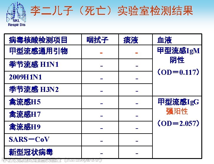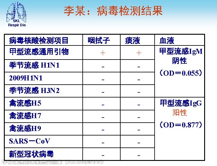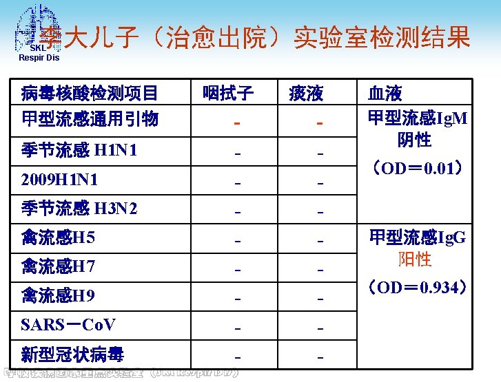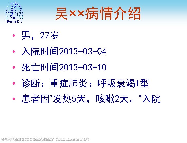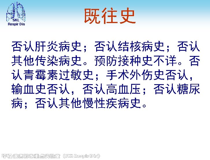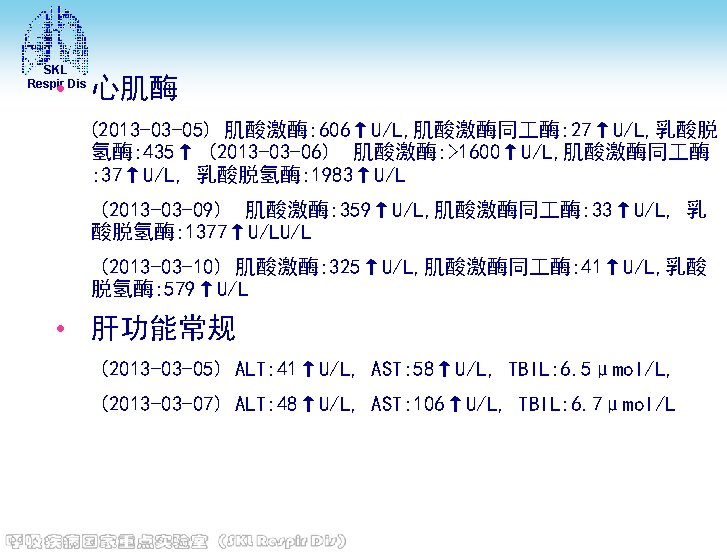 SKL Respir Dis 主要化验结果 • 定量乙肝二对半(2013 -03 -05)Hbs. Ag: > 250. 00(+)IU/m. L, HBs. Ab: (-), Hbe. Ag: (), HBe. Ab: (+), HBc. Ab: (+) • HIV抗体(2013 -03 -05) 阴性 • 免疫六项(2013 -03 -08) 补体C 4: 0. 22 g/L, 总补体; CH 50: 35 U/ml, Ig. G: 11. 5 g/L, Ig. A: 2. 23 g/L, Ig. M: 0. 59 g/L, 补体C 3: 0. 59↓g/L • 血糖(空腹)(2013 -03 -05) 6. 6↑mmol/L • 神经元烯醇化酶(2013 -03 -08) 神经元烯醇化酶 : 30. 41↑ng/m. L
