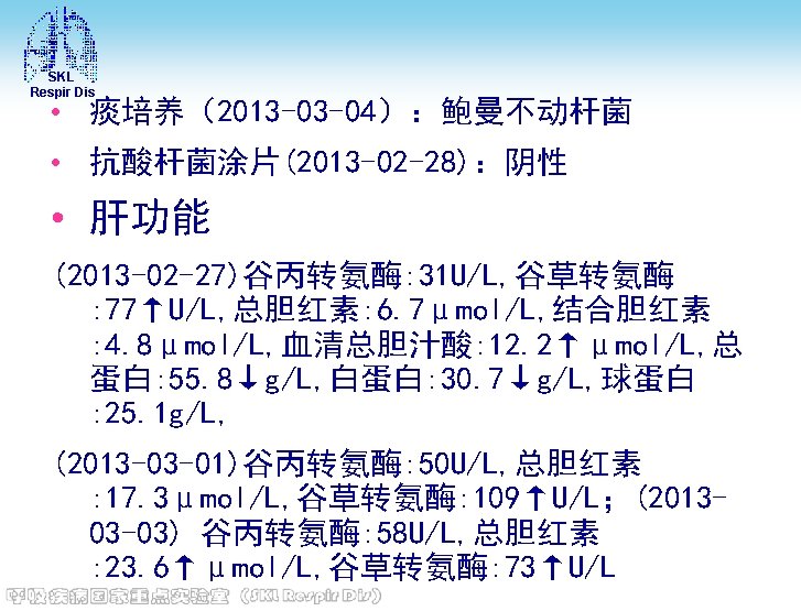 SKL Respir Dis • CRP (2013 -02 -27)114↑mg/L; (2013 -03 -03) 95↑mg/L。 • 肾功能 (2013 -02 -27)尿素: 6. 7 mmol/L, 肌酐: 74μmol/L, 尿酸: 203μmol/L (2013 -03 -01) 尿素: 8. 1↑mmol/L, 肌酐 : 73μmol/L, 尿酸: 206↓μmol/L; (2013 -03 -03) 尿素: 9. 6↑mmol/L, 肌酐 : 95μmol/L, 尿酸: 117↓μmol/L • C肽-空腹(2013 -02 -27): 0. 81 ng/m. L