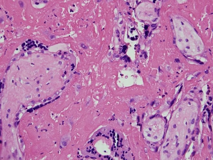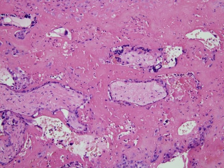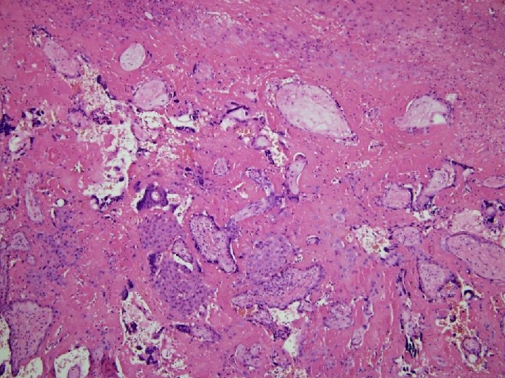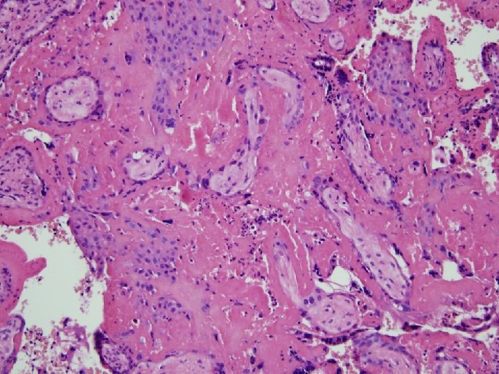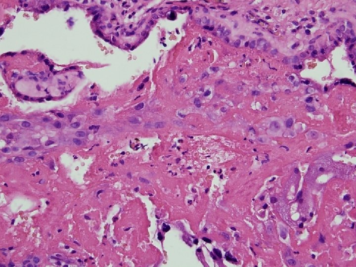 MFD histologie • Choriové klky jsou zality eozinofilně se barvící hmotou (fibrinoid) – V časné fázi jsou klky intaktní – V pozdní fázi • Degenerace a zánik syntitiotrofoblastu • Fibróza klků, hyalinní dystrofie • Obliterace cév - avaskulární klky – Proliferace extravilosního trofoblastu (X bb. ) v masách fibrinoidu event. tvorba cyst • Zůstavají nepostižená místa s volným intervilosním prostorem