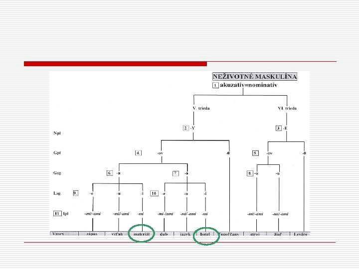 o o Lsg Npl -e -i -i -y -e -y dub stroj hotel/materiál G sg: z hotela/z materiálu