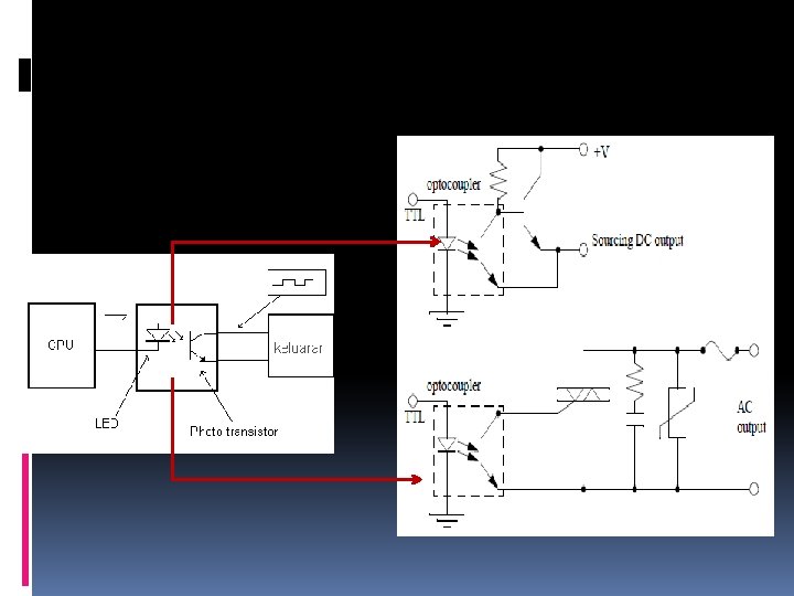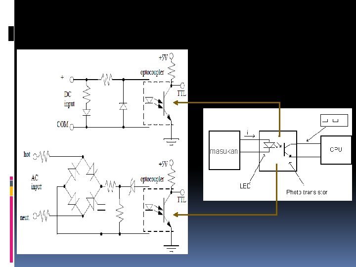 3. Modul Masukan dan Modul Keluaran (Input and Output Modul). Modul masukan berfungsi untuk 1. menghubungkan PLC dengan perangkat keras masukan seperti saklar, sensor, dll 2. mengkonversi atau mengubah sinyal-sinyal masukan dari perangkat keras masukan ke sinyal-sinyal yang sesuai dengan tegangan kerja CPU PLC, 3. modul masukan adalah sebuah rangkaian opto-isolator yang terdiri dari LED (Light Emiting Diode (Dioda Pemancar Cahaya)) dan phototransistor, cara kerjanya yaitu perangkat keras masukan akan memberikan sinyal untuk menghidupkan LED, LED akan memancarkan cahaya dan diterima oleh phototransistor dan akan menghantarkan arus (ON) CPU mengeksekusi sebagai logika NOL , sebaliknya.