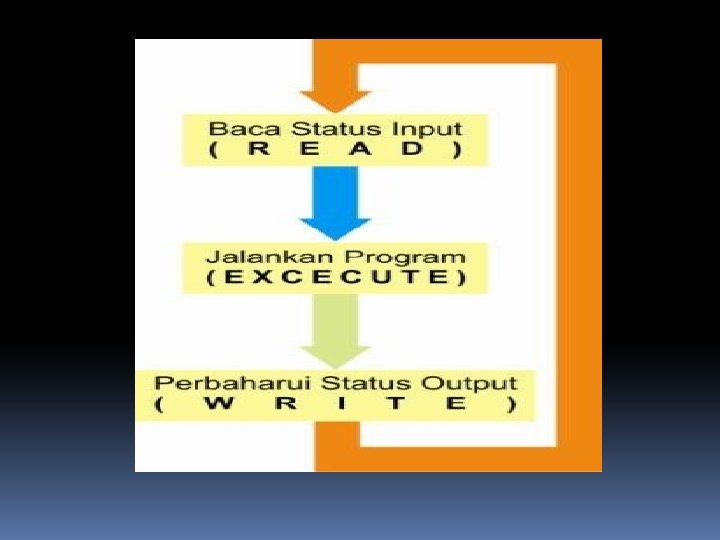 Cara Kerja PLC Selama prosesnya CPU PLC melakukan 3 proses operasi utama : 1. Membaca data masukan dari perangkat luar via modul input 2. Mengeksekusi program kontrol yang tersimpan dimemori PLC 3. Memperbaharui data pada modul output Ketiga proses tersebut dinamakan Scanning.