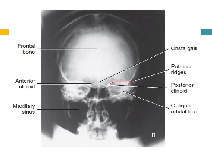 Evaluation Criteria Anatomy Demonstrated: • Frontal bone, crista galli, internal auditory canals, frontal and anterior ethmoid sinuses, petrous ridges, greater and lesser wings of sphenoid, and dorsum sellae are shown. .