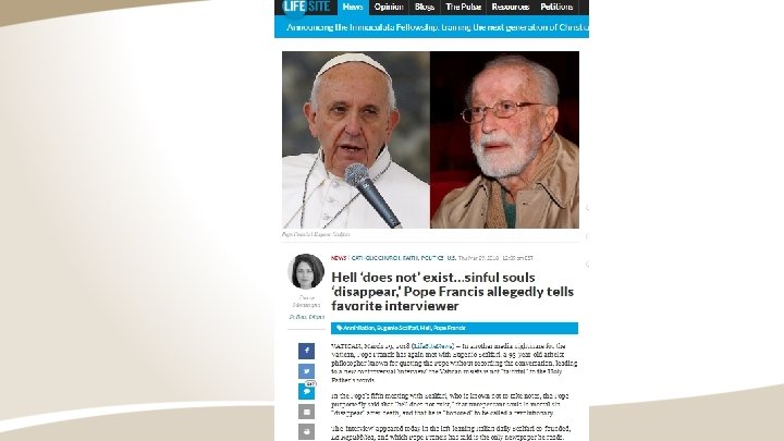 Scalfari: Your Holiness, in our previous meeting you told me that our species will at some point disappear and God will always create other species from his creative seed. You have never spoken to me of souls who have died in sin and go to hell to suffer for it forever. Instead, you have spoken to me of good souls who are admitted to the contemplation of God. But the bad souls? Where are they punished? Pope Francis: “They are not punished, those who repent obtain God’s forgiveness and join the ranks of souls who contemplate him, but those who do not repent and cannot therefore be forgiven disappear. Hell does not exist; the disappearance of sinful souls exists. ”