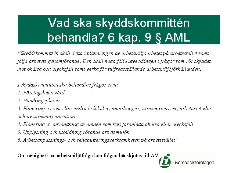 Vad ska skyddskommittén behandla? 6 kap. 9 § AML ”Skyddskommittén skall delta i planeringen av arbetsmiljöarbetet på arbetsstället samt följa arbetets genomförande. Den skall noga följa utvecklingen i frågor som rör skyddet mot ohälsa och olycksfall samt verka för tillfredsställande arbetsmiljöförhållanden. I skyddskommittén ska behandlas frågor som: 1. Företagshälsovård 2. Handlingsplaner 3. Planering av nya eller ändrade lokaler, anordningar, arbetsprocesser, arbetsmetoder och av arbetsorganisation 4. Planering av användning av ämnen som kan föranleda ohälsa eller olycksfall 5. Upplysning och utbildning rörande arbetsmiljön 6. Arbetsanpassnings- och rehabiliteringsverksamheten på arbetsstället” Om oenighet i en arbetsmiljöfråga kan frågan hänskjutas till AV