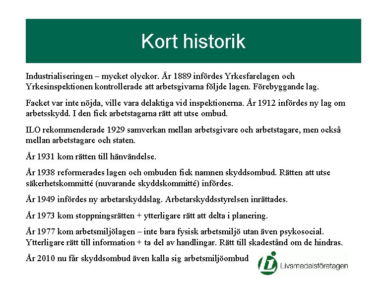 Kort historik Industrialiseringen – mycket olyckor. År 1889 infördes Yrkesfarelagen och Yrkesinspektionen kontrollerade att arbetsgivarna följde lagen. Förebyggande lag. Facket var inte nöjda, ville vara delaktiga vid inspektionerna. År 1912 infördes ny lag om arbetsskydd. I den fick arbetstagarna rätt att utse ombud. ILO rekommenderade 1929 samverkan mellan arbetsgivare och arbetstagare, men också mellan arbetstagare och staten. År 1931 kom rätten till hänvändelse. År 1938 reformerades lagen och ombuden fick namnen skyddsombud. Rätten att utse säkerhetskommitté (nuvarande skyddskommitté) infördes. År 1949 infördes ny arbetarskyddslag. Arbetarskyddsstyrelsen inrättades. År 1973 kom stoppningsrätten + ytterligare rätt att delta i planering. År 1977 kom arbetsmiljölagen – inte bara fysisk arbetsmiljö utan även psykosocial. Ytterligare rätt till information + ta del av handlingar. Rätt till skadestånd om de hindras. År 2010 nu får skyddsombud även kalla sig arbetsmiljöombud