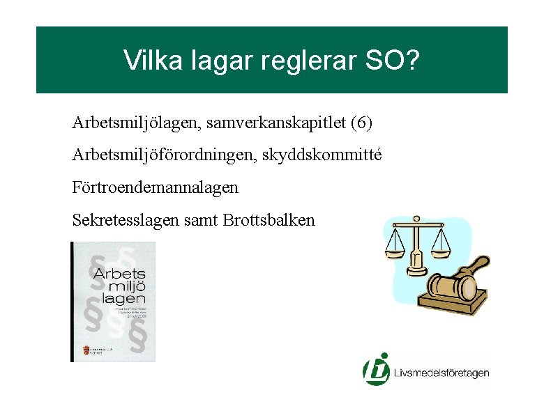 Vilka lagar reglerar SO? Arbetsmiljölagen, samverkanskapitlet (6) Arbetsmiljöförordningen, skyddskommitté Förtroendemannalagen Sekretesslagen samt Brottsbalken