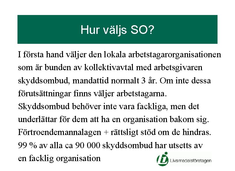 Hur väljs SO? I första hand väljer den lokala arbetstagarorganisationen som är bunden av kollektivavtal med arbetsgivaren skyddsombud, mandattid normalt 3 år. Om inte dessa förutsättningar finns väljer arbetstagarna. Skyddsombud behöver inte vara fackliga, men det underlättar för dem att ha en organisation bakom sig. Förtroendemannalagen + rättsligt stöd om de hindras. 99 % av alla ca 90 000 skyddsombud har utsetts av en facklig organisation