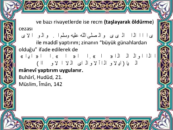 ﺍﻟ ﺍﻯ ﻯ ﻻ ﻻ ، ﺍ ﺍ ﻯ ﺍ ﺍﻟ Kur'an'ın, namuslu ve iffetli kadınlara zina iftirasında bulunup yeterli delil sunamayanlara maddî müeyyide yanında, sosyal itibarlarını derinden sarsacak bir ceza olarak “ömür boyu şahitliklerinin reddedilmesi” hükmünü de getirmesi, ﴾ 24﴿ ﺩﻳ ﺍ ﺍﻭﺍ ﻭ “Namuslu kadınlara zina isnat edip sonra da dört şahit getiremeyenlere seksen değnek vurun. Artık onların şahitliğini asla kabul etmeyin. İşte bunlar fâsık kimselerdir. ” Nûr, 24/4