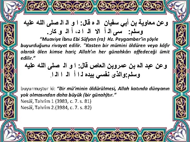 ﻗﺎﻝ ﺭﺳﻮ : ﻋﻦ ﺳﻌﻴﺪ ﺑﻦ ﺍﻟﻌﺎﺹ ﺍﻟ ﻩ ﻋﻦ ﺍﺑﻦ ﻋﻤﺮ ﺍﻟ ﻫﻤﺎ ﻗﺎﻝ . ﻥ ﻳﺍ ﺍ ﻓﻲ ﻳ ﺍ ﻣ ﺍﻣ : ﺍﻟ ﺻﻠﻰ ﺍﻟﻠﻪ ﻋﻠﻴﻪ ﻭﺳﻠﻢ Said İbnu'l-As, İbni Ömer’in şöyle dediğini rivayet ediyor: "Resulullah (sav), "Mü'min, öldürülmesi haram kılınan bir cana kıymadıkça “dinî tesâmüh” içerisindedir. ” Bu bağlamda İbni Ömer’in şöyle dediği rivayet edilir: ﺃ ﻓﻴﺍ ﺍﻟ ﺍﺍ ﺇ ﺍ ﺍ‘ﻭ ﺍ "Bir kimsenin içine düştüğü, kurtuluşu çok zor olan işlerden biri de haksız yere haram kan dökmesidir. ". Buharî, Diyât 1