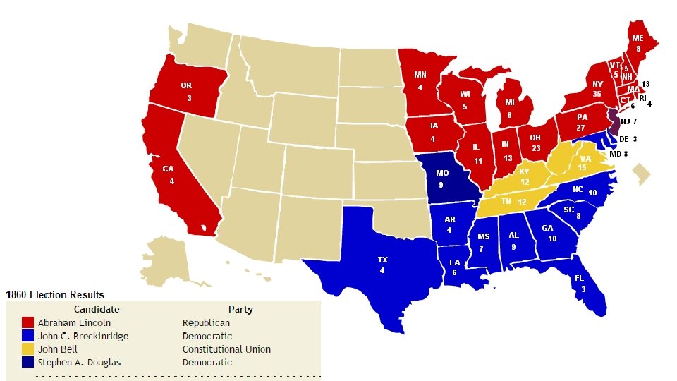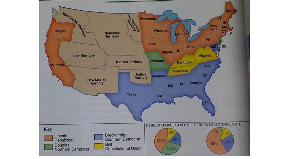 Popular Vote 39. 8% Electoral Votes 180 States Carried 17 Breckenridge S. Democrat 18. 1% 72 11 Douglas N. Democrat 29. 5% 12 1 John Bell Constitutional Union 12. 6% 39 3 Lincoln Republican