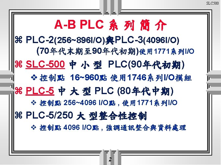 SLC 500 z 固定型 SLC-500 中 小 型 PLC v 內建主機 , 電源及I/O於一體, 內建DH 485 v 1747 -L 20(12 /8 ) 1747 -L 30(18 / 12 ) 1747 -L 40(24 / 16) v 可擴充二槽式框架 , 加大點數至 72點 v 1 K 程式指令Word. z Micro. Logix 1000 固定型(內建RS 232) : v 10(6 in/4 out), 16(10 in/6 out) , 32(20 in /12 out) z 模組式 v 5/01 1747 -L 511(1 K) I/O最大 256點(內建DH 485) 1747 -L 514(4 K) v 5/02 1747 -L 524(4 K) I/O最大 480點(內建DH 485) v 5/03 1747 -L 532(12 K) I/O最大 960點 (內建RS 232, DH 485) v 5/04 1747 -L 541(16 K) I/O最大 960點(內建RS 232, DH+) L 542(28 K) L 543(64 Kword) v 5/05 內建(RS 232, Ether. Net) v Open Controller 1747 -OC PC Base Controller 4