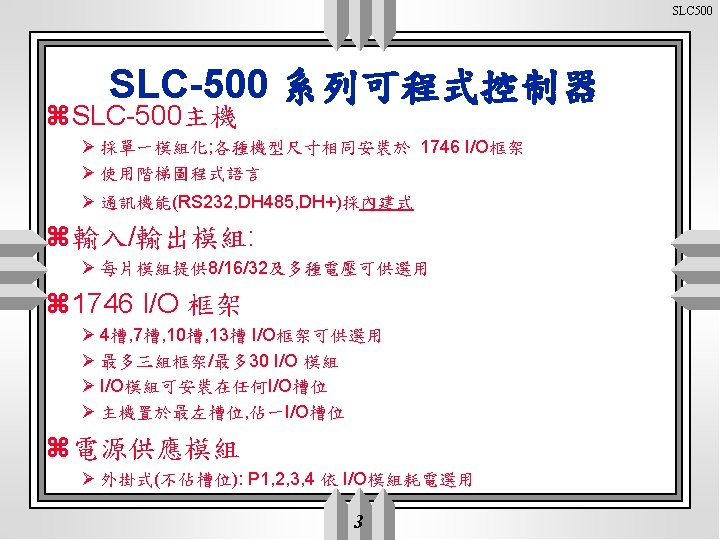 SLC 500 v BASIC 模組(1746 -BAS) 提供 1 DH 485, 2 RS 232/422/485埠 掌上型程式書寫器 v單軸伺服控制(1746 -HS) IMC 110 v高速計數模組(1746 -HSCE) 可達 50 KHz v步進控制模組(1746 -HSTP 1) z通訊模組: v. DH 485/DF 1 232 通訊(1747 -KE模組式, 1770 -KF 3獨立型) v REMOTE控制(1747 -SN)可擴充4 Rack(512 in/512 out), 最多 8片SN v REMOTE端界面(1747 -ASB)可管理30片模組 v DH 485/232界面(1747 -PIC) v 電腦DH+/DH 485網路卡(1784 -KTX) v C函數庫Interchange 9351 -DKTS v DH 485網路隔離器(1747 -AIC) 10