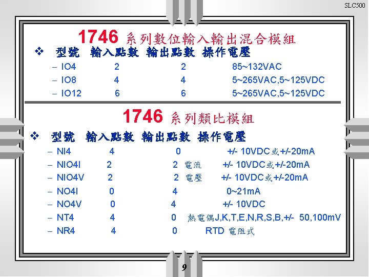 SLC 500 1746 系列數位輸出模組 v 型號 點數 – – – – OA 8 OA 16 OB 8 OB 16 OB 32 OBP 16 OV 8 OV 16 OV 32 OVP 16 OG 16 OW 4 OW 8 OW 16 OX 8 8 16 32 16 16 4 8 16 8 操作電壓 信號延遲 85~265 VAC " 10~50 VDC source " 5~50 VDC source 20. 4~26. 4 VDC source 10~50 VDC sink " 5~50 VDC sink 20. 4~26. 4 VDC sink 4. 5~5. 5 VDC sink 5~265 VAC , 5~125 VDC 8 接點輸出 獨立接點 On Off ms 電流A 1 1 0. 25 10 10 11 11 1 1 1 1 0. 5 10 10 1 0. 5 0. 1 1. 5 0. 024 1~2. 5 1~5