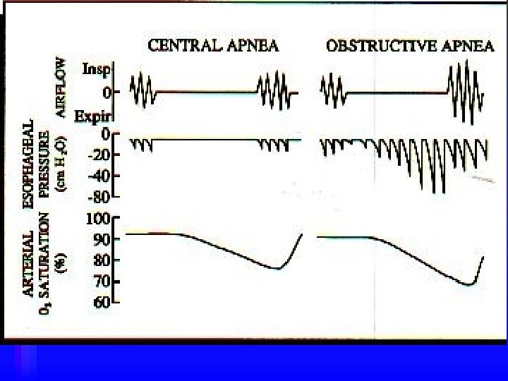 Central Sleep Apnea • Respiratory centers of the medulla fail to send signals to the respiratory muscles • Cessation of airflow at the nose and mouth, no inspiratory efforts & desaturation of Hb • Associated with CNS disorders • Accounts for 10% of all sleep apneas