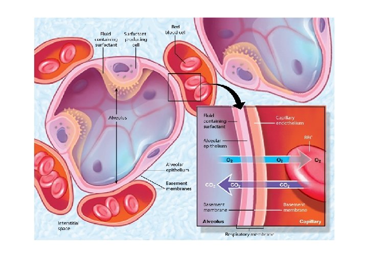 BRONCHI, BRONCHIOLES, AND ALVEOLI • Structure – Trachea branches into right and left bronchi – Each bronchus branches into smaller and smaller tubes eventually leading to bronchioles – Bronchioles end in clusters of microscopic alveolar sacs, the walls of which are made up of alveoli (Figure 14 -7) • Function – Bronchi and bronchioles—air distribution; passageway for air to move to and from alveoli – Alveoli—exchange of gases between air and blood (Figure 14 -8)