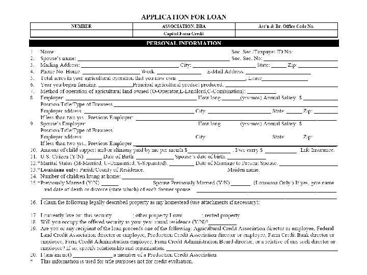 Farm Credit System ü FCS became wholly borrower-owned when the last government loan was repaid in 1968. ü FCS is regulated by the Farm Credit Administration, which is an agency of the Federal government’s Executive Branch. The FCA regularly examines loan portfolios to ensure compliance with sound lending practices set forth in examination manuals.