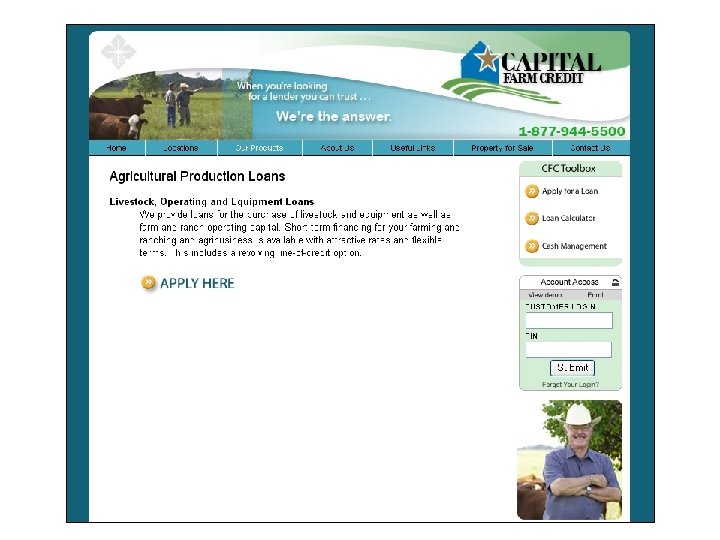 You can apply electronically for various types of loans from the Capital Farm Credit Association.