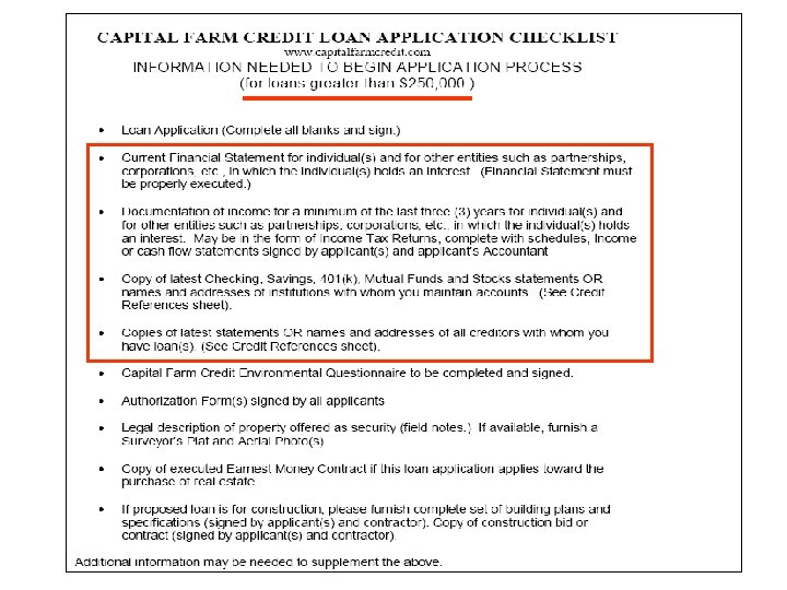 Both Sides of the Desk The borrower: • Enterprise analysis • Cash management • Line of credit needs • Operating loan application • Investment planning • Term loan application • Planning for long run