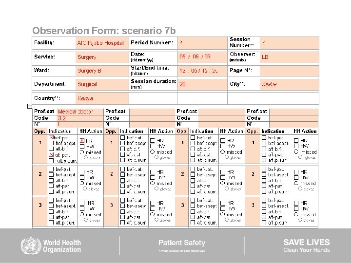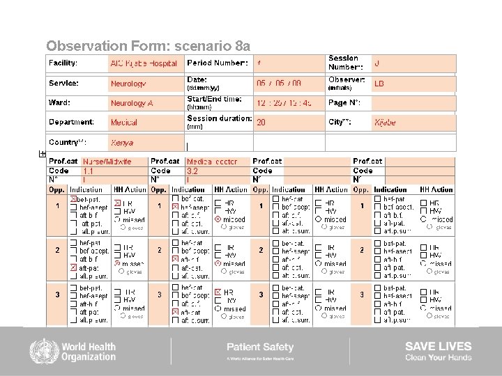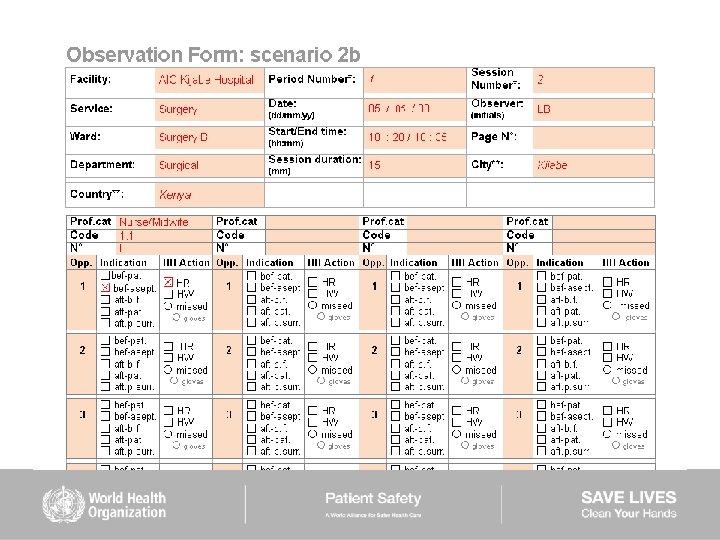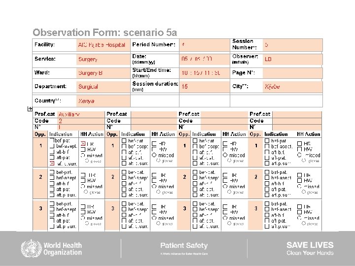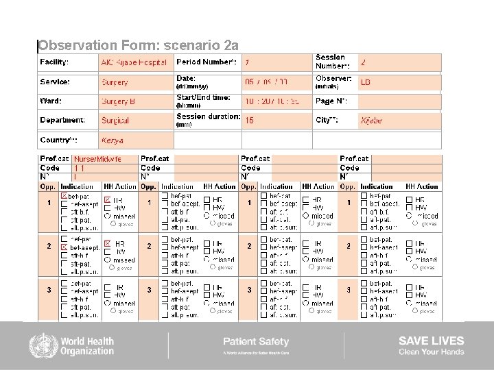 HAND HYGIENE SCENARIOS User instructions (2) Scenarios 6– 9: ■ are intended to be used mainly to train observers ■ should be used while completing the Observation Form ■ show examples of sequences of health care during which several indications for hand hygiene occur ■ missed hand hygiene actions are shown in some scenarios but a duplicate of each of them is provided showing 100% hand hygiene compliance