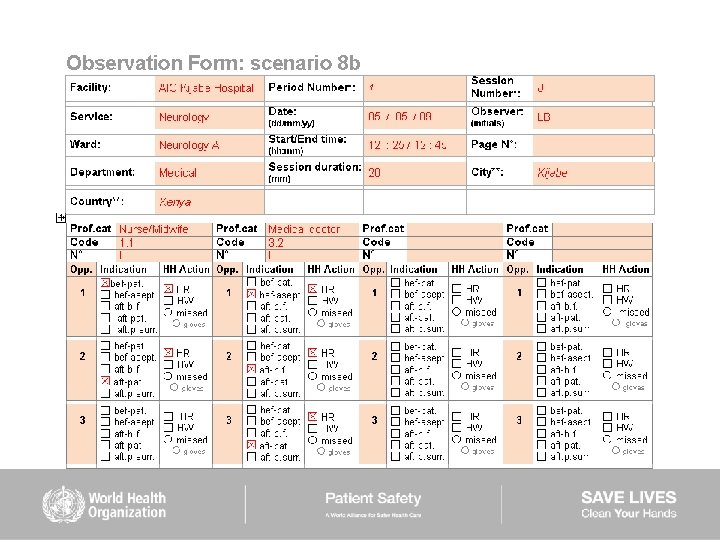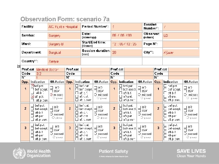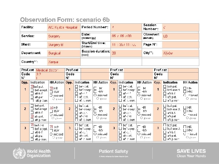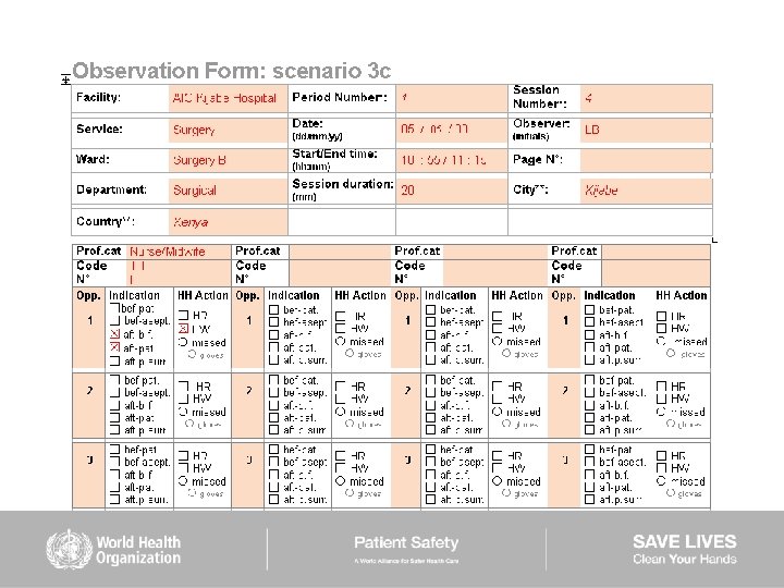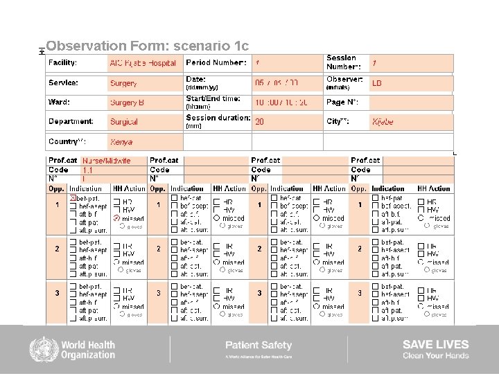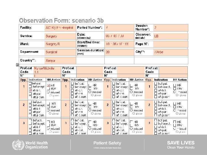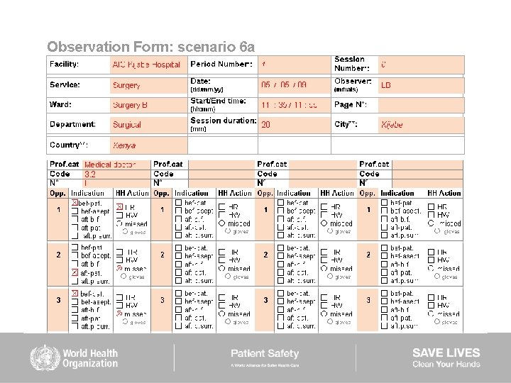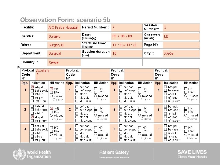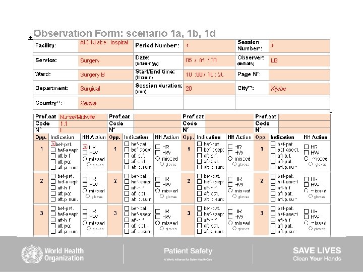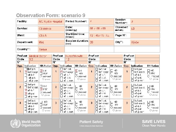 HAND HYGIENE SCENARIOS User instructions (2) Scenarios 6– 9: ■ are intended to be used mainly to train observers ■ should be used while completing the Observation Form ■ show examples of sequences of health care during which several indications for hand hygiene occur ■ missed hand hygiene actions are shown in some scenarios but a duplicate of each of them is provided showing 100% hand hygiene compliance