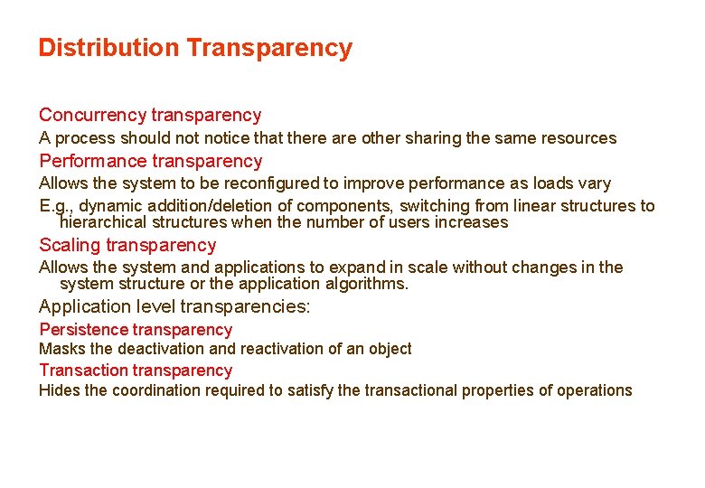 Distribution Transparency Concurrency transparency A process should notice that there are other sharing the same resources Performance transparency Allows the system to be reconfigured to improve performance as loads vary E. g. , dynamic addition/deletion of components, switching from linear structures to hierarchical structures when the number of users increases Scaling transparency Allows the system and applications to expand in scale without changes in the system structure or the application algorithms. Application level transparencies: Persistence transparency Masks the deactivation and reactivation of an object Transaction transparency Hides the coordination required to satisfy the transactional properties of operations
