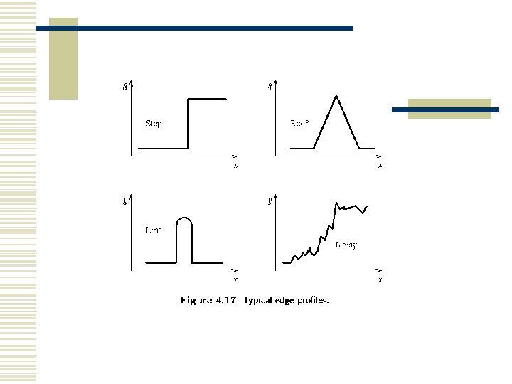 • A digital image is discrete in nature, derivatives must be approximated by differences. • The first differences of the image g in the vertical direction (for fixed i) and in the horizontal direction (for fixed j) • n is a small integer, usually 1. The value n should be chosen small enough to provide a good approximation to the derivative, but large enough to neglect unimportant changes in the image function.