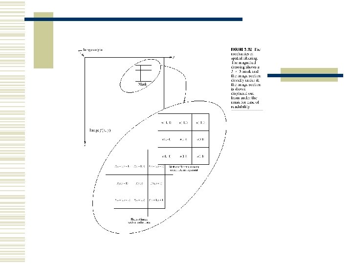 Image smoothing = image blurring Averaging of brightness values is a special case of discrete convolution. For a 3 x 3 neighborhood the convolution mask w is Applying this mask to an image results in smoothing. Matlab example program is filter. Ex 1. m • Local image smoothing can effectively eliminate impulsive noise or degradations appearing as thin stripes, but does not work if degradations are large blobs or thick stripes.