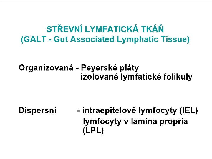GALT • • • Ústní dutina až rectum Mikrobiální fyziologická flora 1012 Epitelové buňky a slizniční imunitní systém Ochrana před mikroorganismy a p. H Apoptóza epiteliálních buněk a transport antigenů do podslizniční vrstvy