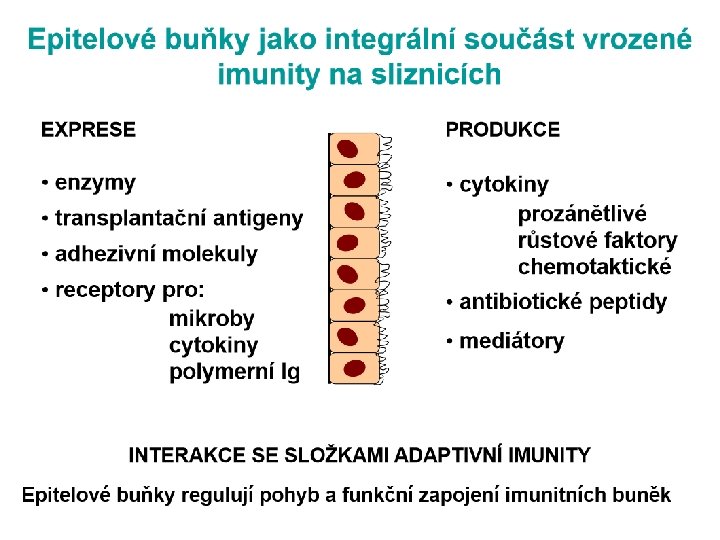 Úloha epitelových buněk • Přímá ochrana před vniknutím mikroorganismů • Kooperace s intraepitelovými T-lymfocyty pomocí adhezivních interakcí • Produkce humorálních složek regulujících aktivitu epitelových buněk