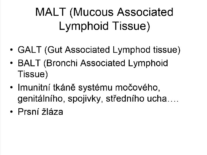 Slizniční imunitní systém gastrointestinálního traktu GALT • Difúzně rozptýlené lymfoidní buňky střevní sliznice • Agregáty lymfoidních buněk v mukózní vrstvě • Peyerovy pláty • Apendix • Mezenterické lymfatické uzliny • Játra