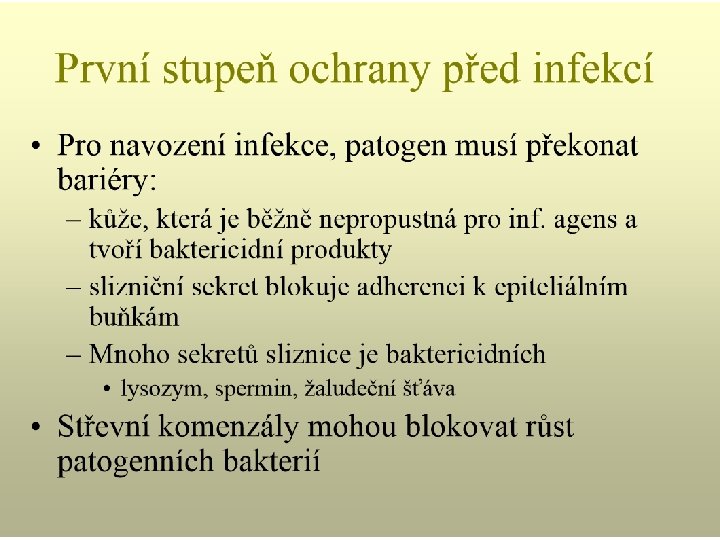 Antibakteriální mechanismy sliznice • Residentní mikroflora – kompetice s exogenními bakteriemi • Hlen - lepkavý materiál – „vychytává“ bakterie • Lysozym – štěpí stěnu bakterií • Lactoferrin – váže železo • Lactoperoxidasa – volné radiály zabíjí bakterie • Antibakteriální peptidy • Cilie epithelií • Tight junction epitelií – ochrana před invazí