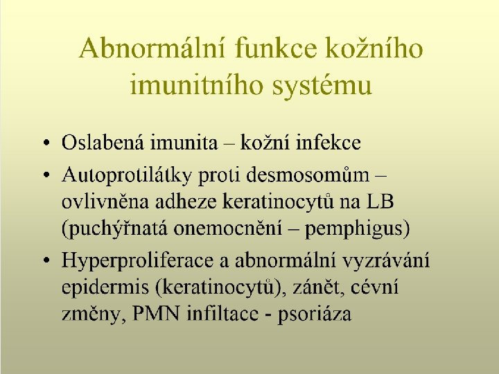 Klinické imunopatologické stavy spojené s poruchou imunitní funkce kůže • Puchýřnatá onemocnění kůže – pemphigus vulgaris, pemphigoid • Psoriasis • Atopická dermatitida • UV světlo