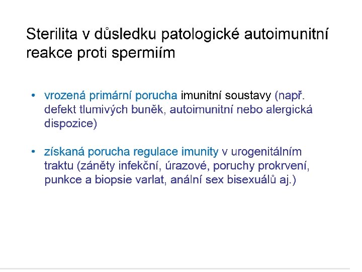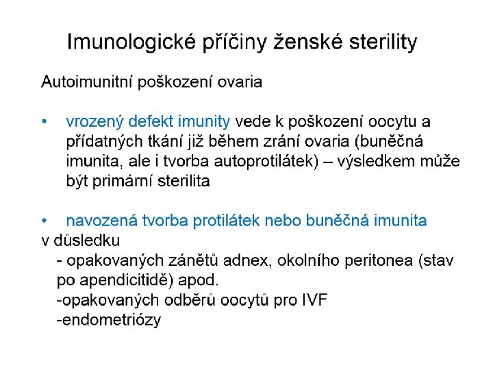 Imunologie reprodukce – negativní mechanismy - muži • Přítomnost protilátek proti spermiím • Důvody vzniku – narušená hematotestikulární bariera z důvodů poranění, po vasektomii, chronické infekce urogenitálního traktu, častější u homosexuálních mužů • V ejakulátu se pak nacházejí Ig třídy Ig. G a Ig. A • Ve spermatu infertilních mužů často zvýšený počet leukocytů - vznik reaktivních kyslíkových radikálů – perforace cytoplazmatické membrány spermií – zabránění fúze s plazmatickou membránou vajíčka