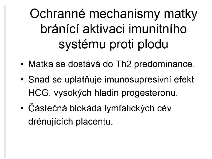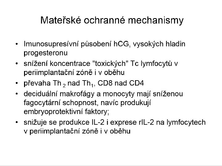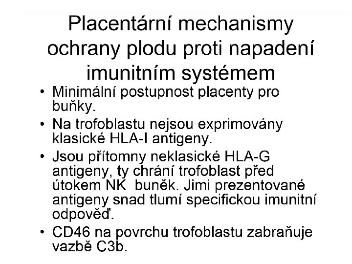 embryonální ochranné mechanismy : pasivní: velmi nízká exprese klasických HLA znaků A, B, C na buňkách cytotrofoblastu (chybějí antigeny HLA-DR a DQ, které jsou nutné pro aktivaci imunitní odpovědi) aktivní: produkce nespecifických tlumivých působků (alfa-fetoprotein, h. CG) a indukce Th 2 buněk v mateřské deciduální tkáni klíčovou funkci má produkt embryonálního HLA-G genu