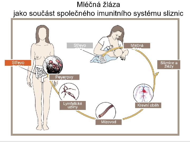 Cesty lymfocytů v těle • Imunitní reakce, které jsou následkem stimulace sliznic, nevedou jen k odpovědi v místě imunizace a na vzdálených místech. Imunitní buňky zorganizované lymfatické tkáně sliznic jsou aktivovány a migrují nejprve lymfatickou a potom krevní cestou, vracejí se na slizniční povrchy a do exokrinních žláz („homing“). Migrace slizničních lymfocytů a jejich usidlování na základě adhezivních interakcí se slizničním endotelem je podkladem tzv. společného slizničního systému. Tímto mechanismem je např. zajištěno, že kojenec dostává v mateřském mléce protilátky a buňky namířené proti antigenům přítomným ve střevě matky (např. antigeny mikroflóry), se kterými se novorozenec také setkává v prvních dnech po narození („enteromamární osa“).