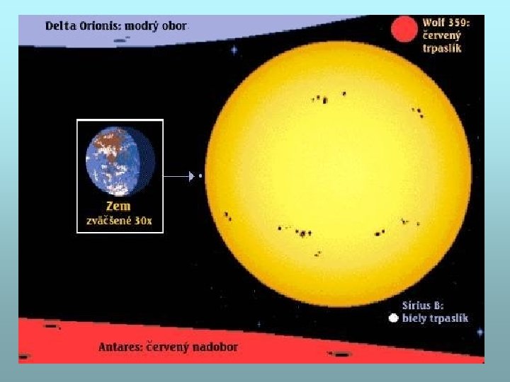 Veľkosť Slnka V porovnaní s inými hviezdami je Slnko mierne nadpriemerná hviezda. Niektorý trpaslíci, ako napríklad Sírius B a Wolf 359, sú iba zlomkom veľkosti Slnka. Obrie hviezdy, ako Delta Orionis, môžu byť 10 až 50 krát väčšie. Nadobor Antares mám priemer 300 krát väčší ako naše Slnko a niektoré hviezdy sú ešte väčšie! V porovnaní so Zemou a ostatnými planétami, Slnko je obrovská, takmer dokonalá guľa. Ale veľkosť Slnka nie je stála. Slnečný priemer sa scvrkáva o meter každú hodinu.