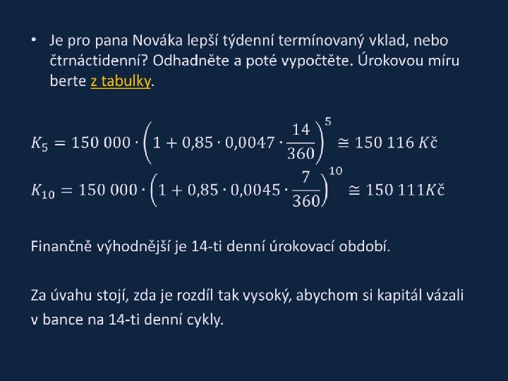 • Pracujte s předchozím zadáním a vypočtěte jej (dle současných podmínek úročení bank, každý si vyhledejte na internetu jinou banku). Která banka má vyšší úroky? Jak velký je rozdíl ve výši úroku?