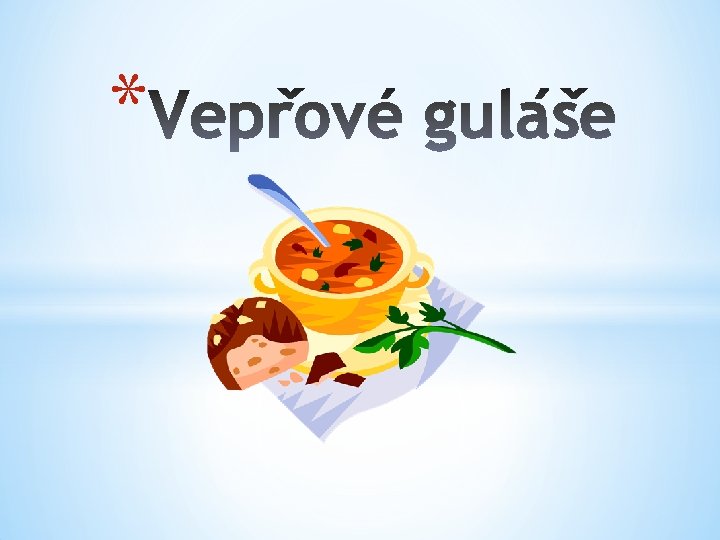 * Číslo projektu: CZ. 1. 07/1. 5. 00/34. 0124 Název projektu: Škola budoucnosti s využitím IT Název materiálu: VY_7_INOVACE_TE 12 Název školy: Střední průmyslová škola a Střední odborná škola gastronomie a služeb, Most, p. o. Předmět: Technologie Tematický okruh: Pokrmy z vepřového masa Téma: Vepřové guláše Ročník: 3. Jméno autora: Ing. Vendulka Štěrbová Datum tvorby: 22. 09. 2012 Anotace: Prezentace seznamuje žáky s přípravou vepřových gulášů. Materiál je určen pro žáky 3. ročníku obor Gastronomie do předmětu „Technologie“. Slouží k procvičení učiva na interaktivní tabuli.