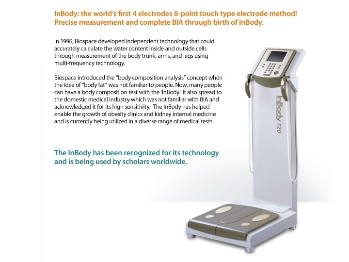 • DEXA (Dual Energy X-Ray Absorptiometry) – duální rentgenová absorpciometrie – měří diferenciální ztenčení dvou rtg paprsků, které procházejí organismem, rozlišuje kostní minerály od měkkých tkání, a ty rozděluje na tukuprostou hmotu. • Bioelektrická impedence: Multifrekvenční bioimpedanční technologie (MF-BIA) In. Body - segmentální analýzu tělesného složení, odděleně tak měří hrudník a končetiny, a je schopna měřit tekutiny mimo i uvnitř buňky. Bipolární přístroje, tertapolární přístroje, i pro domácí použití …